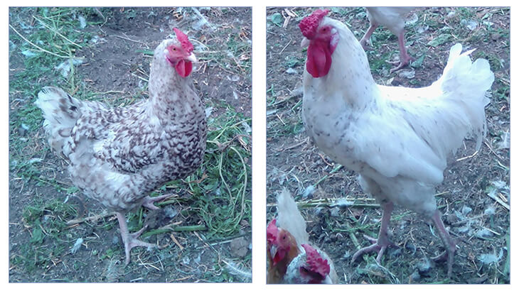 Legbar, Leghorn. Již v jednom dni věku je opeření slepic jednobarevné – bílé, šedé, černé. A samci mají na těle pruhy.