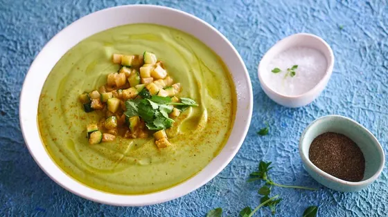Krémová cuketová a celerová polévka se skvěle hodí k velkým kusům rustikálního bílého chleba upečeného na olivovém oleji a potřeného pestem ze sušených rajčat.