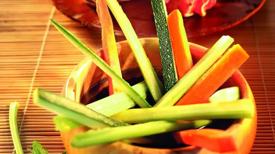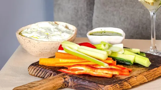 Čerstvé okurky, sladká mrkev, stonky celeru a sladké vícebarevné papriky se perfektně hodí k zakysané smetanové omáčce připravené podle klasického receptu.