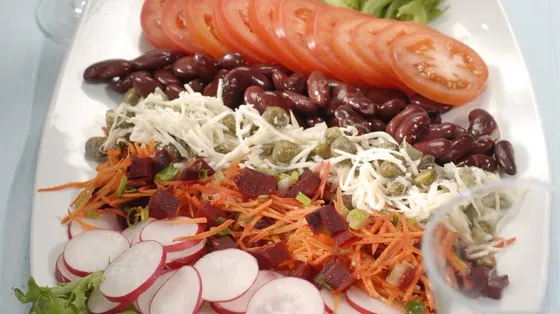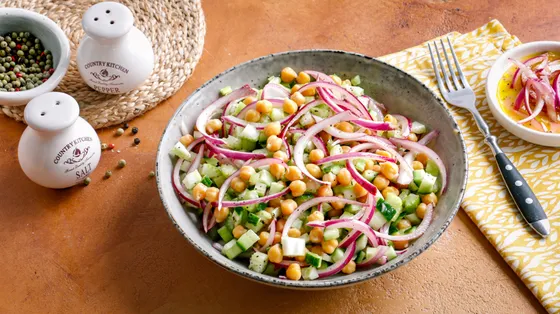 Tento salát je díky cizrně docela uspokojivý, ale všechny ostatní ingredience jsou extrémně lehké. A dresink se skládá hlavně z citronové šťávy a kůry. Místo červené cibule si můžete vzít zelenou – ale s červenou je to nějak zábavnější a elegantnější.